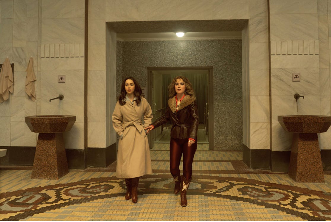 Maybe because it’s brutally frigid in New York City, but I was especially drawn to the sassy coat collection of Twila (Haley Lu Richardson), a street-smart, outspoken, and audacious young American. After her CIA spy husband Tom (John Macmillan) and fellow spook Chris (Louis Boyer) die in a mysterious plane crash, she partners with fellow widow Bea (Emilia Clarke) to go undercover in Moscow to find the culprits. Twila’s brashness clashes with — and complements — Bea’s cautious and tentative nature, as do their opposing styles of sublime ’70s outerwear.